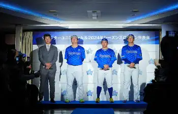 4年ぶりに一新したビジターユニホームは伝統を継承するストライプで、横浜の「海」とファンの押し寄せるような「声援」をイメージした「波形」を合わせたデザイン。新主将の牧が「一目ぼれです。強そう」と4種類の候補から選んだ。