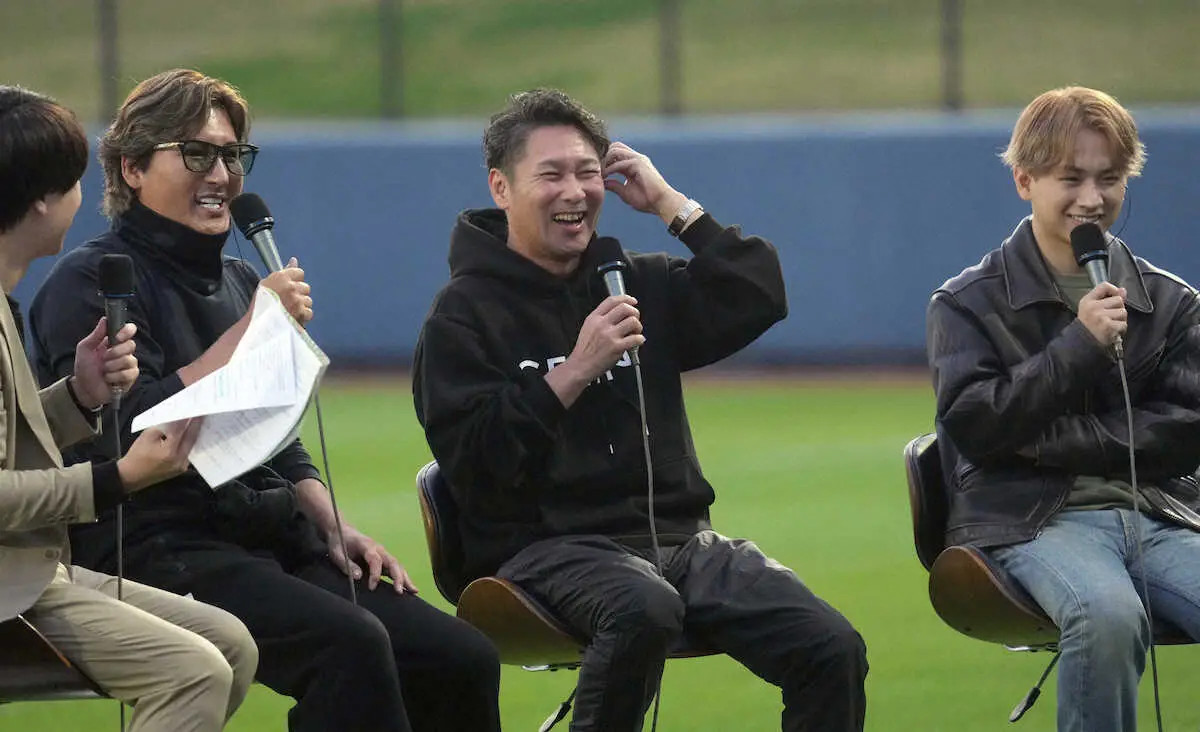 同学年の元木氏とのトークを繰り広げた新庄監督は、ユニホームを交換するしぐさを見せ「(去年の)シーズン中、交流戦の時に来年はこっちでって。でも少し休ませてくれと言われて」とコーチ就任のオファーをしていたことを明かした。