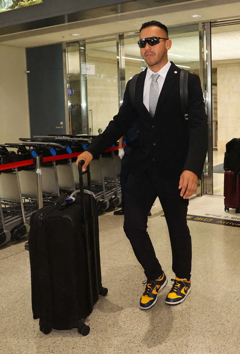 スーツに虎カラーのスニーカーで沖縄入りした阪神・ゲラ(撮影・岸 良祐)
