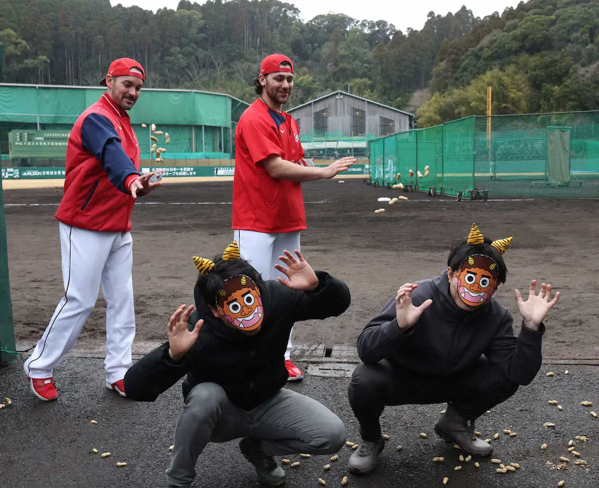 広島新加入のレイノルズとシャイナーが天福球場の三塁ベンチ横で「オニハソト」と連呼しながら豆をまいた。「人に向かってピーナッツを初めて投げた。非常に楽しい文化だと思う」とレイノルズ。シャイナーも「米国で友達とやっても楽しいと思う。思い出になる」とニッコリだ。キャンプ3日目にして初めて屋外でランチ特打に汗を流し、そろって充実の表情だった。