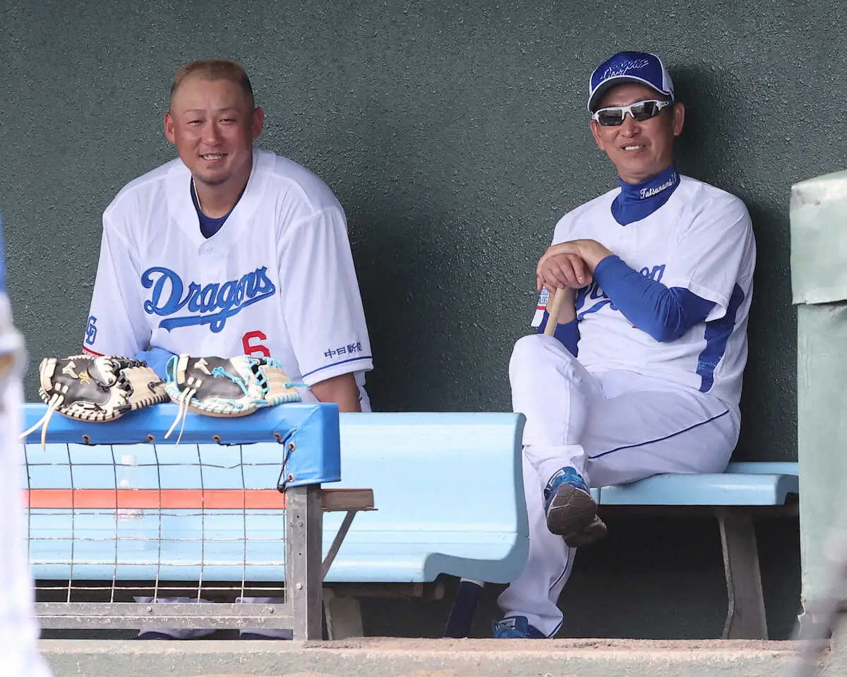 <中日キャンプ>打撃練習を終え、笑顔で立浪監督(右)と話す中田(撮影・椎名 航)
