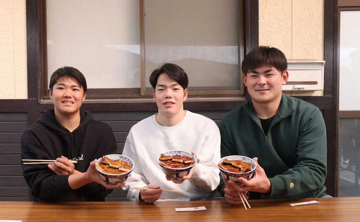 その後、日南市内のうなぎ料理屋を訪れ、宮崎県が日本3位の養殖生産量を誇るウナギのつかみ取りに挑戦。3人とも悪戦苦闘しながら、約5分かけて、ようやく滝田が一番乗りでつかみ取った。「相手の弱いところを突いてつかみました。1軍の舞台をつかみ取って、良い試合を何試合も見せられるように頑張っていきたい」と力を込めた。