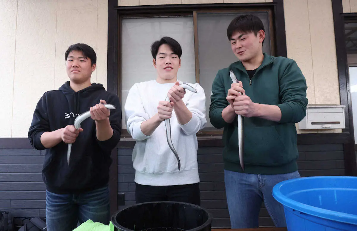 ◎広島のドラフト3位左腕・滝田(星槎道都大)は他の新人2人とキャンプ休日のイベントでウナギのつかみ取りに挑戦。見事、一番につかみ取り「相手の弱いところを突いた。日頃から(動きを)意識している」。野球の観察力を生かしたそうです。