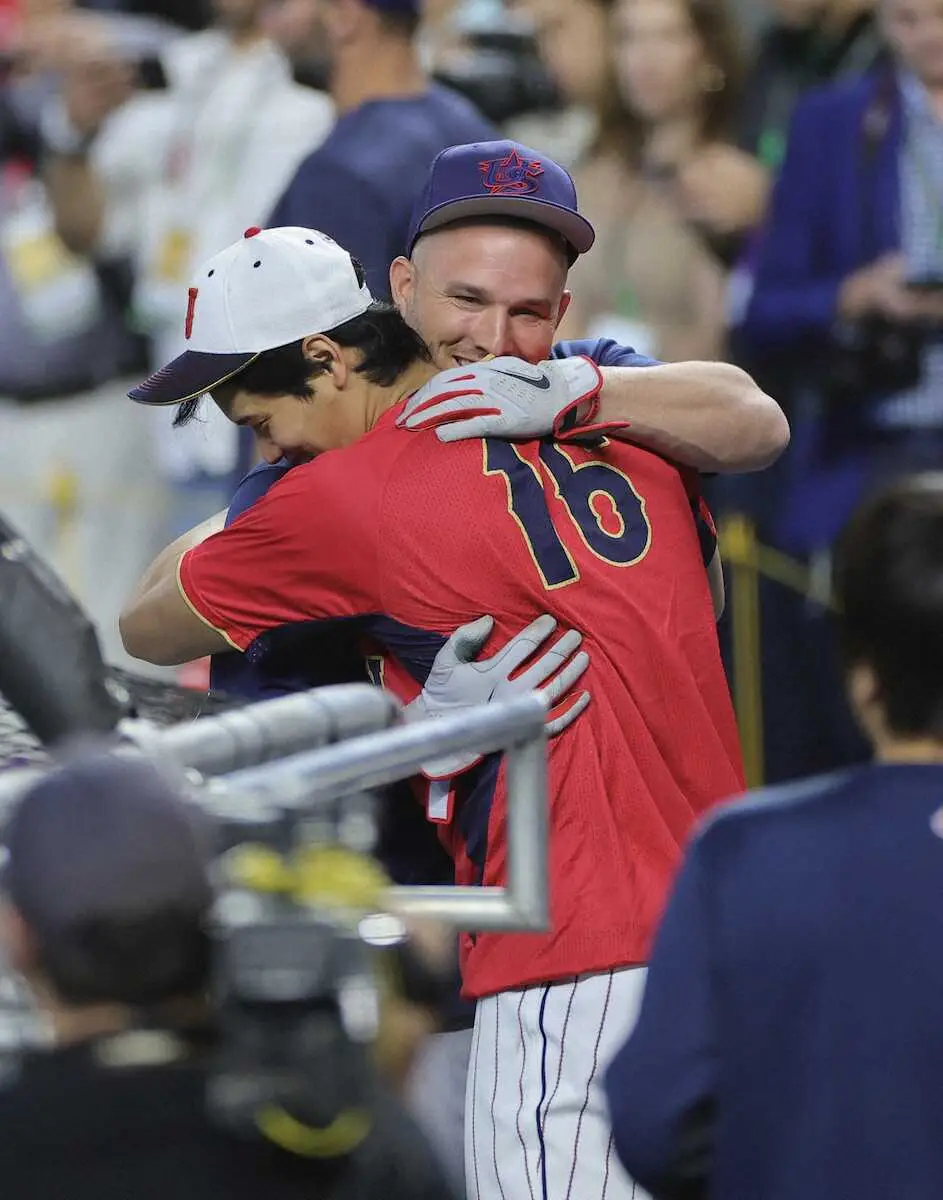 23年WBC決勝の試合前、抱き合うトラウト(右)と大谷