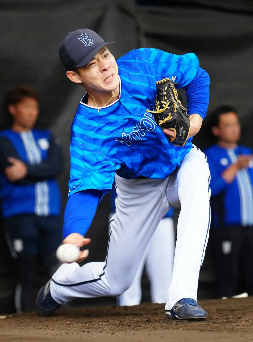 ブルペン入りした右下手の変則腕は「拾っていただいてトップバッターで投げるので、1年間戦力になるようにアピールしたい」。立大から20年ドラフト4位でオリックスに入団も、1軍登板は21年の1試合のみ。