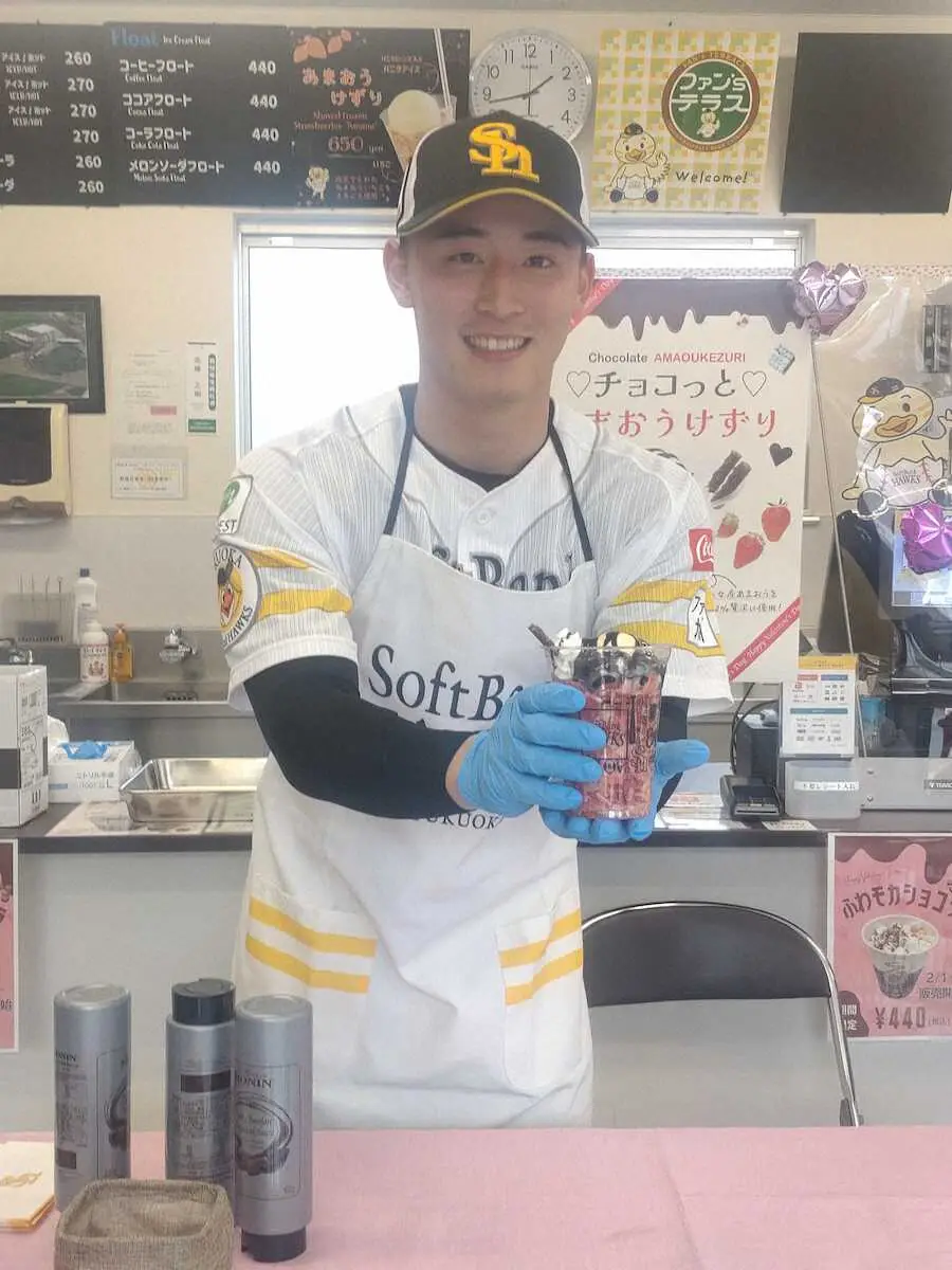 ソフトBドラ7・藤田悠「チョコっと あまおうけずりお渡し会」参加 エプロン姿でチョコをかける