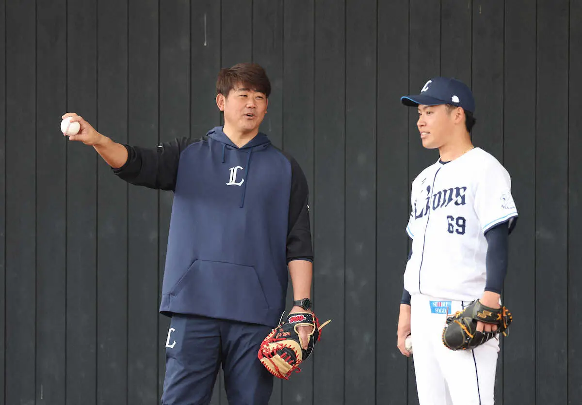 昨年、西武キャンプで選手にアドバイスを送った松坂氏(左)が今年も臨時コーチを務める