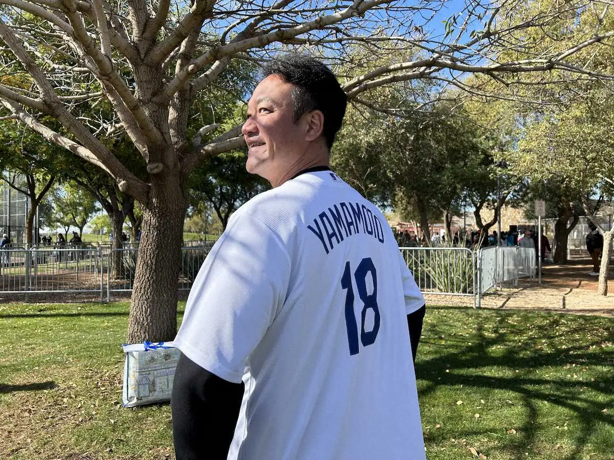 親交のある山本のドジャースユニホームを着用してキャンプ初日に訪れたたむらけんじ(撮影・柳原 直之)