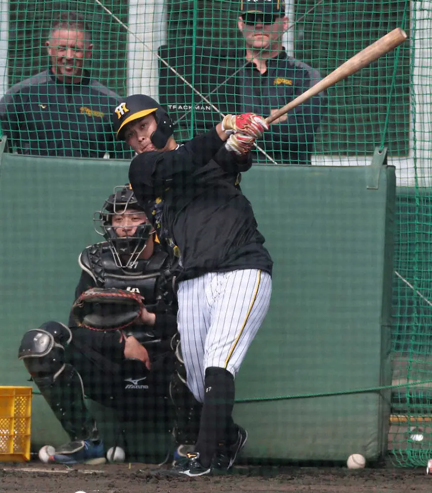 【畑野理之の談々畑】阪神・井上広大と野口恭佑が競うように大きな放物線を外野芝生席に放り込んだ。三塁側から打撃投手が投げるレーン、打撃マシンをカーブに設定したレーン、そして打撃マシンをストレートに設定した3カ所のフリー打撃。3連休初日の土曜日、気温17度、天気は快晴。今キャンプ最多の観衆1万1000人の虎ファンは若い2人のその打球に今季の飛躍を期待した。