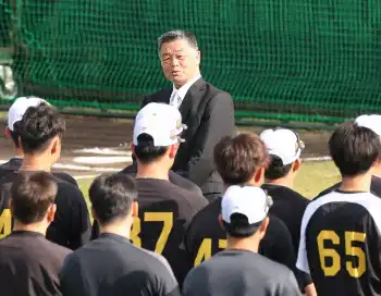 岡田監督、選手を前に川藤OB会長は「一番大事なこの時期のキャンプで1年が決まる。連覇のチャンスをものにするかしないは、キャンプをどう乗り切るか」と語り、野手で大山、近本、投手で青柳の名前を挙げ、3人が若いチームを引っ張ることを期待した。