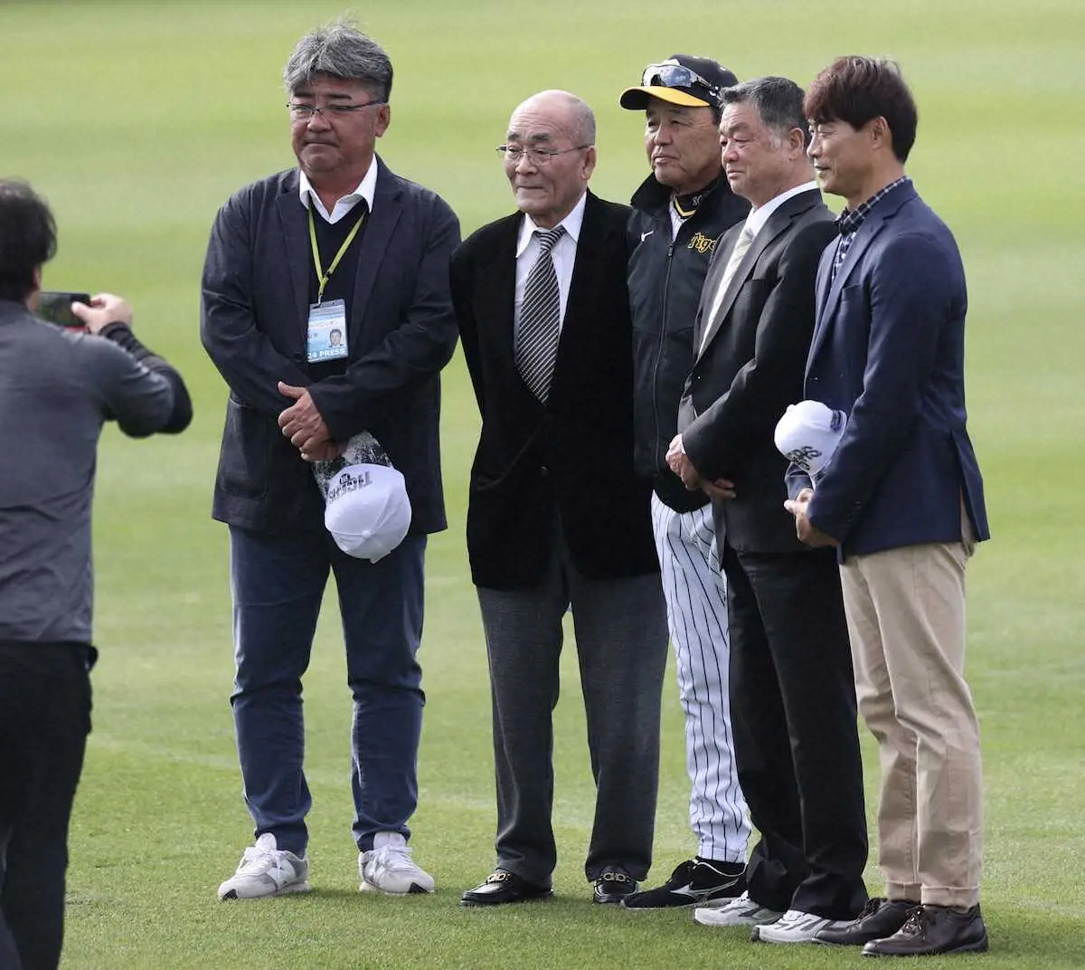 <阪神宜野座キャンプ>記念撮影する(左から)亀山氏、末永氏、岡田監督、川藤氏、桧山氏(撮影・須田 麻祐子)