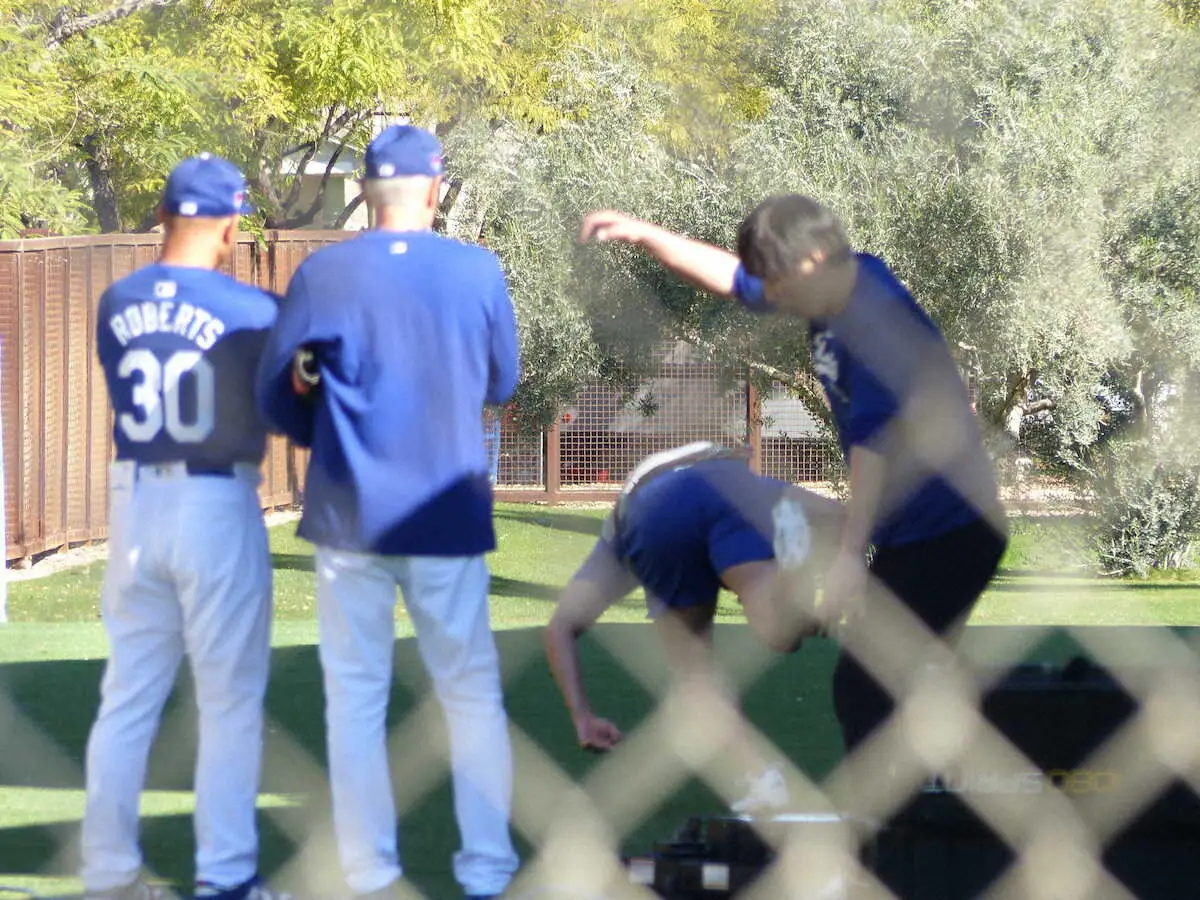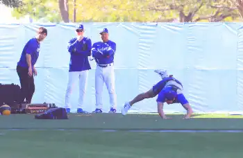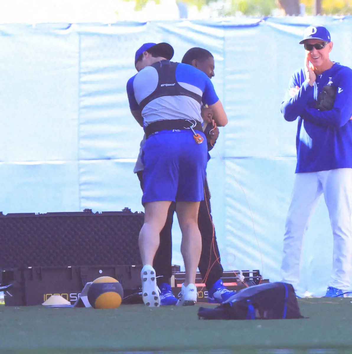 <ドジャースキャンプ>強烈なダッシュでワイヤーを切った大谷はトレーナーにハグして詫びる(撮影・白鳥 佳樹)
