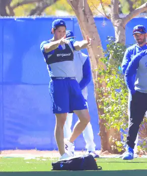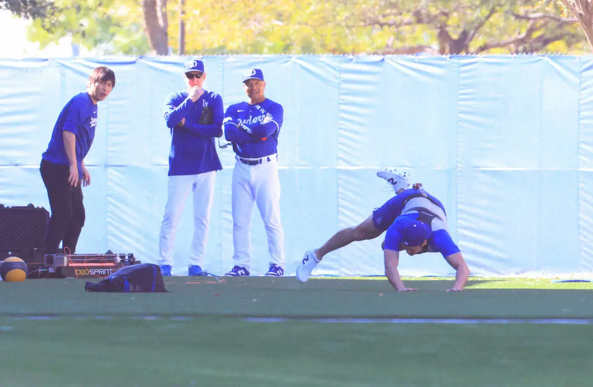 <ドジャースキャンプ>リラックスムードで練習する大谷 (撮影・白鳥 佳樹)