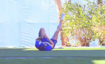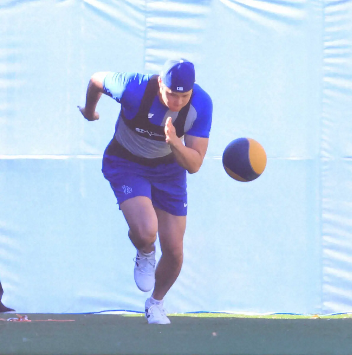 <ドジャースキャンプ>強烈なダッシュに機械のワイヤーが切れて転倒する大谷(撮影・白鳥 佳樹)