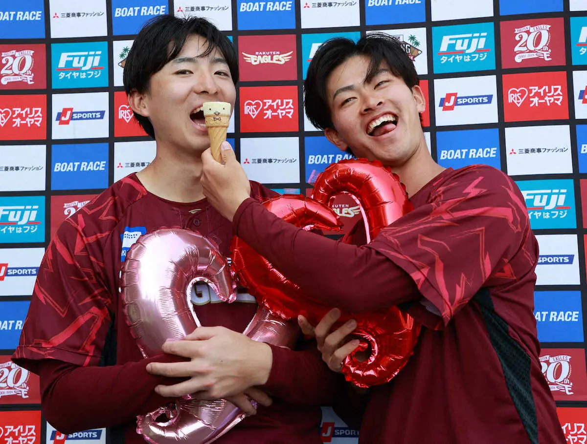 14日のバレンタインデーを前に、楽天ドラフト1位の古謝(桐蔭横浜大)と、22年ドラフト1位の荘司がチョコレート菓子を食べさせ合った。