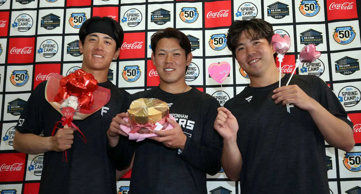 日本ハム・根本、北山、金村の3投手が女性報道陣からバレンタインデーのプレゼントを贈られた。