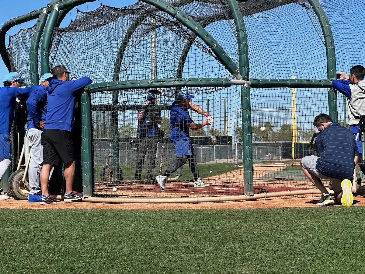 キャンプインを前にフリー打撃を行うカブスの鈴木