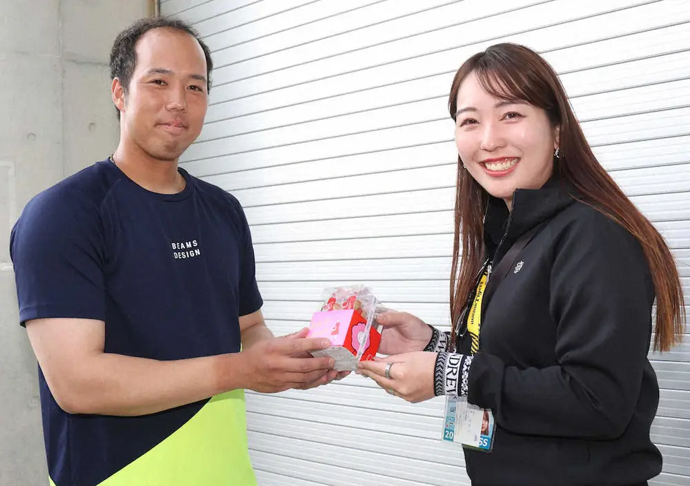 阪神・青柳(左)にチョコレートを手渡す山手記者(撮影・須田 麻祐子)