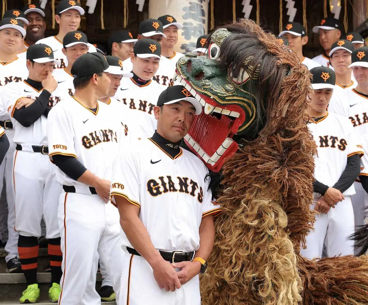 巨人の沖縄キャンプがスタート 沖宮恒例“獅子舞ガブリ”で阿部監督は真顔撮影「ベタでしょ?」