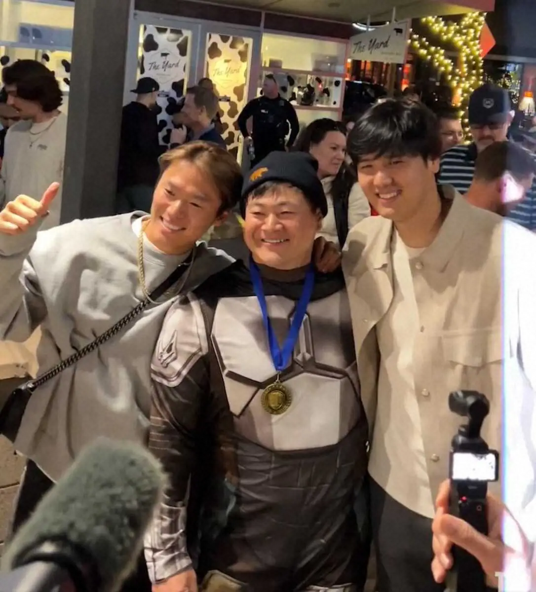 手羽先大食いコンテストで優勝した園田通訳を囲む山本(左)と大谷(右)(球団公式SNSより)