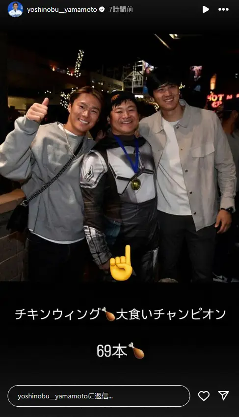 ドジャース球団が開催した「手羽先大食いコンテスト」で、山本由伸投手(25)の通訳を務める園田芳大(よしひろ)氏が69本を食べて優勝。山本が17日、自身のインスタグラムのストーリーズを更新し、様子を紹介した。
