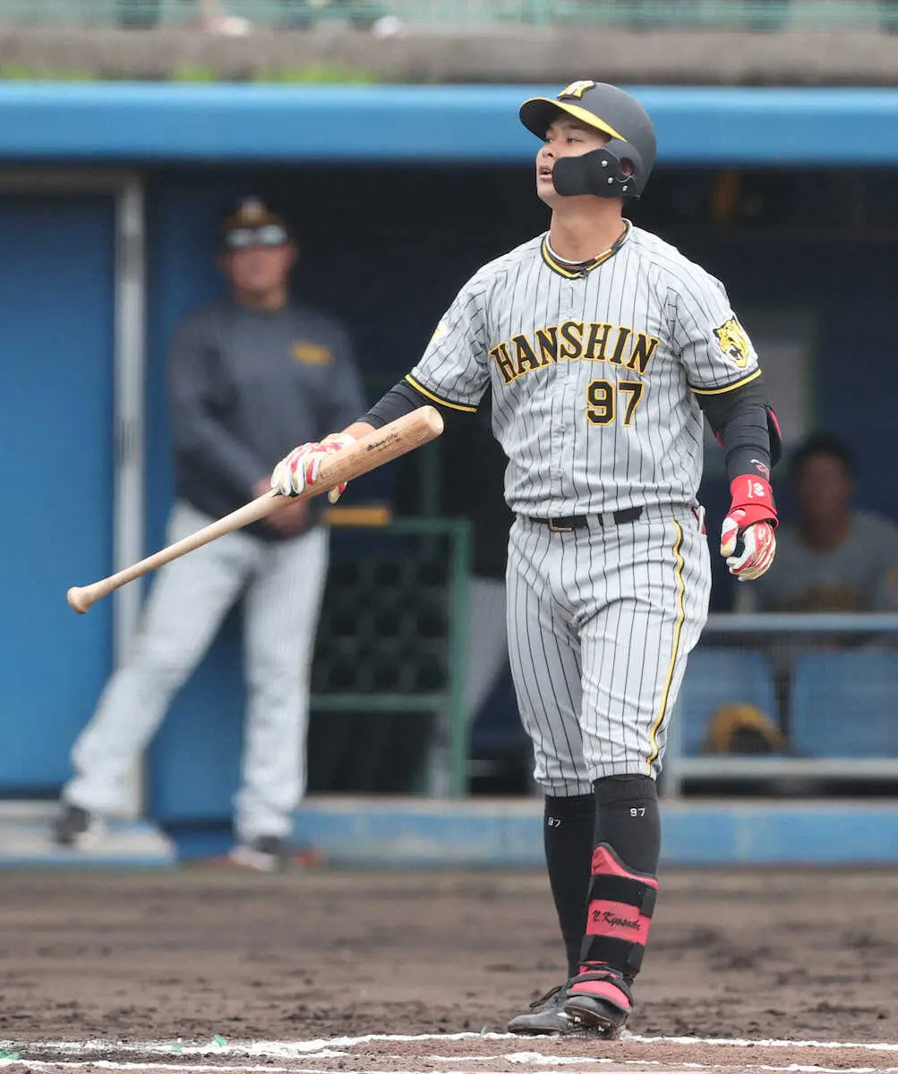 <練習試合 中日2軍・阪神2軍>6回、阪神・野口は捕邪飛に倒れ、打球の行方を見つめる(撮影・椎名 航)