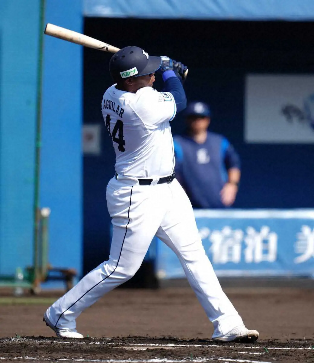 昨季4番を固定できず5位に終わったチームに、大きな新戦力が加わった。メジャー114発を誇る西武の新外国人、ヘスス・アギラー内野手(33=前ブレーブス傘下)が18日、宮崎・南郷キャンプの紅白戦で2ランを放った。チームの今季初実戦で、隅田を相手にいきなり力を証明した。
