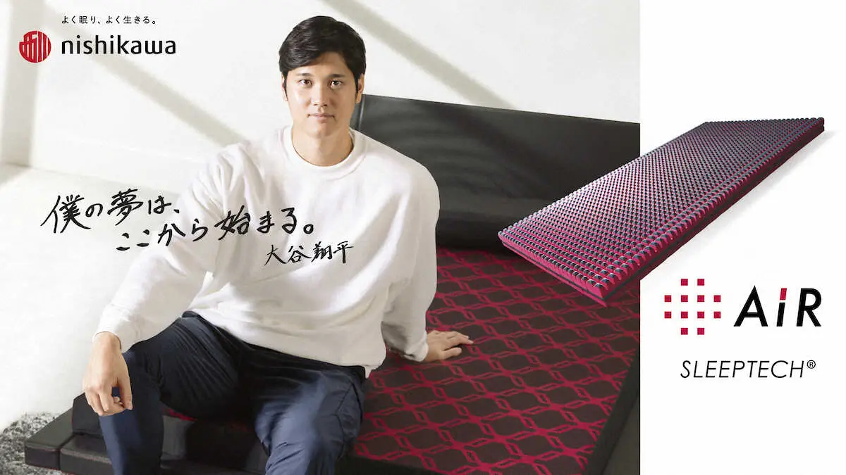 寝具大手の西川は19日、サポート8年目を迎えた大谷との「一緒に夢を見よう!キャンペーン」を21日から開始すると発表した。コンディショニング・マットレス「エアー」のイメージキャラクターを務める大谷のコメントもリリースされ、愛犬のデコピンにも「エアー」をプレゼントしたことを明かした。