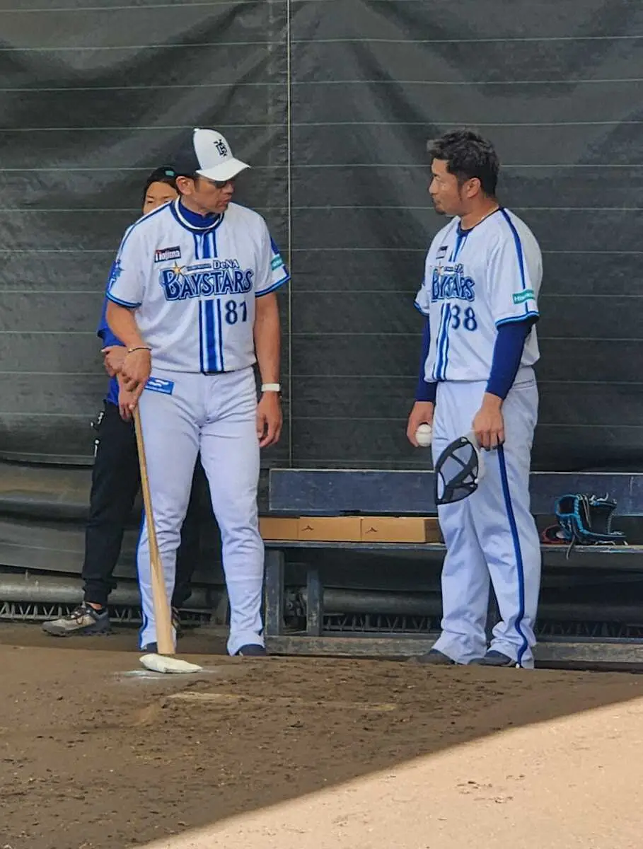 三浦監督(左)からアドバイスをもらうDeNA・森唯
