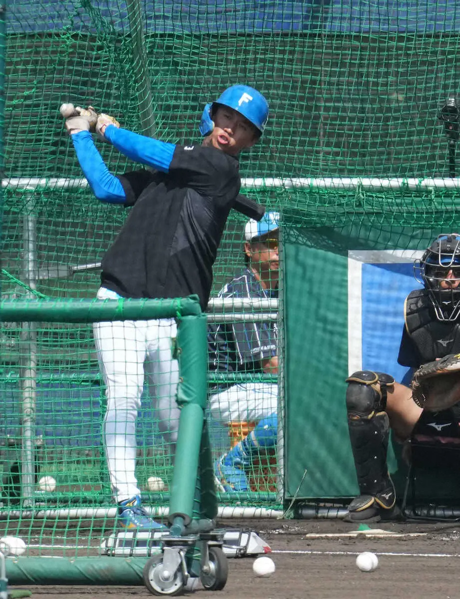 フリー打撃を行う日本ハム・加藤豪(撮影・高橋 茂夫)