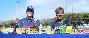 練習終了後には山口航輝外野手(23)と韓国ロッテの金元中(キム・ウォンジュン)投手(30)が「トッポ」やガムなど日本と韓国のロッテ製品を食べ比べる企画も。炎天下の陸上競技場でお菓子を食べた山口は「良い経験になった」と苦笑いした。