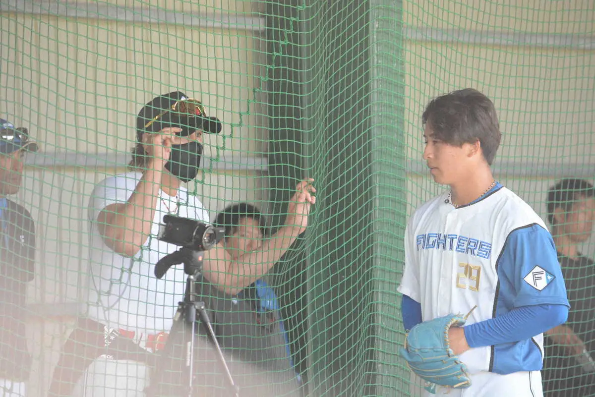 細野が30球を投げ終えると、あいさつに来たドラ1左腕へネット越しに「新庄教室」を開校。セットしたグラブの中のボールを持つ手の位置や角度などをアドバイスした。