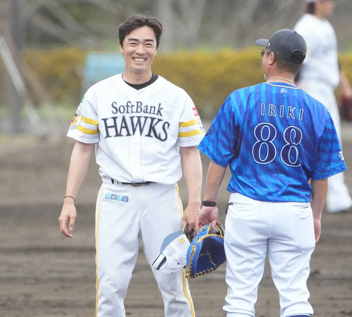 <ソフトバンク宮崎キャンプ>DeNA・入来コーチ(右)と笑顔で話す和田(撮影・岡田 丈靖)