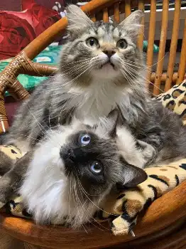 メインクーンのルル君と、ラグドールのロロ君の2匹を飼っています。年齢はともに8歳。巨人の寮を出るときに猫を飼いたいな、と。ペットショップへ行くと、同じ部屋にルルとロロがいました。