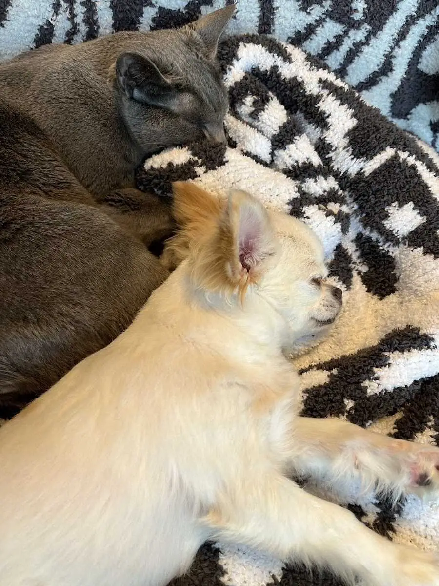 僕は猫好きですが、いわゆる“猫派”とかではなく、実は犬も飼っています。名前はおもち、2歳のロングコートチワワの女の子です。2匹はとても仲良しで、よく一緒にお昼寝しています。