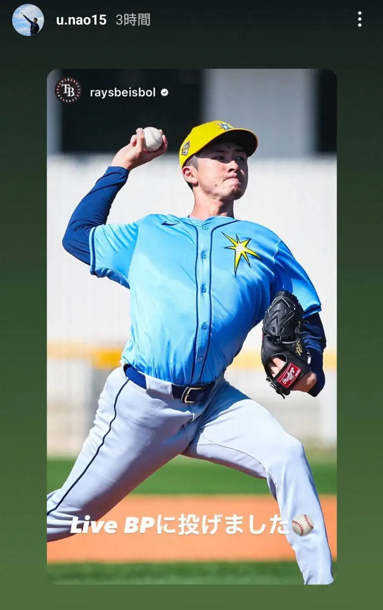レイズとマイナー契約を結び、招待選手として米フロリダ州でのキャンプに参加している上沢直之投手(30)が23日(日本時間24日)、キャンプ初のライブBPに登板した。上沢も自身のインスタグラムのストーリーズで「Live BPに投げました」と報告した。