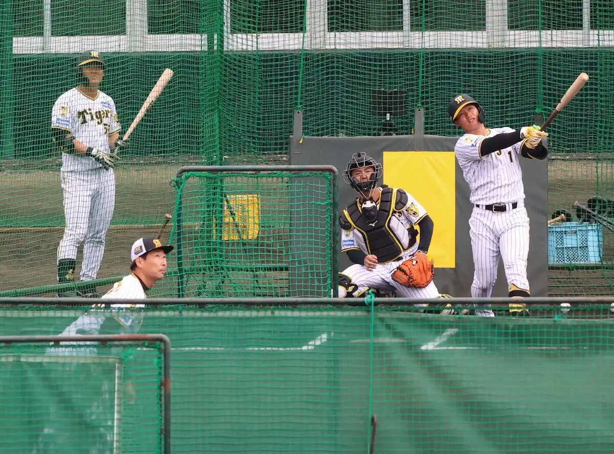 阪神の前川右京、森下翔太が26日、ベテランの西勇、岩崎のフリー打撃登板の相手をし、打ち上げ前日のスタンドを沸かせるアーチをかけた。
