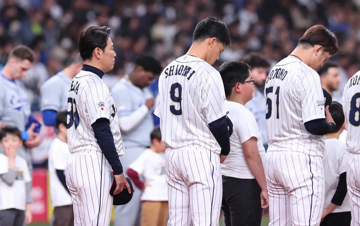 <日本代表・欧州代表>試合前、黙祷をする井端監督(左)ら(撮影・平嶋 理子)