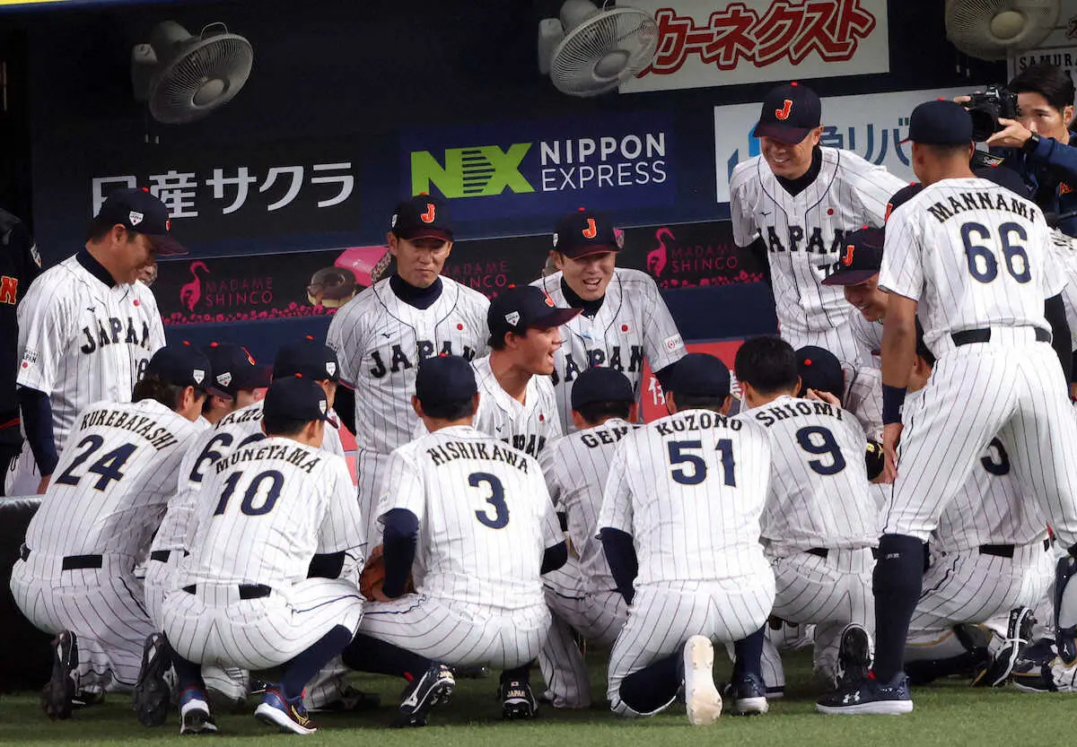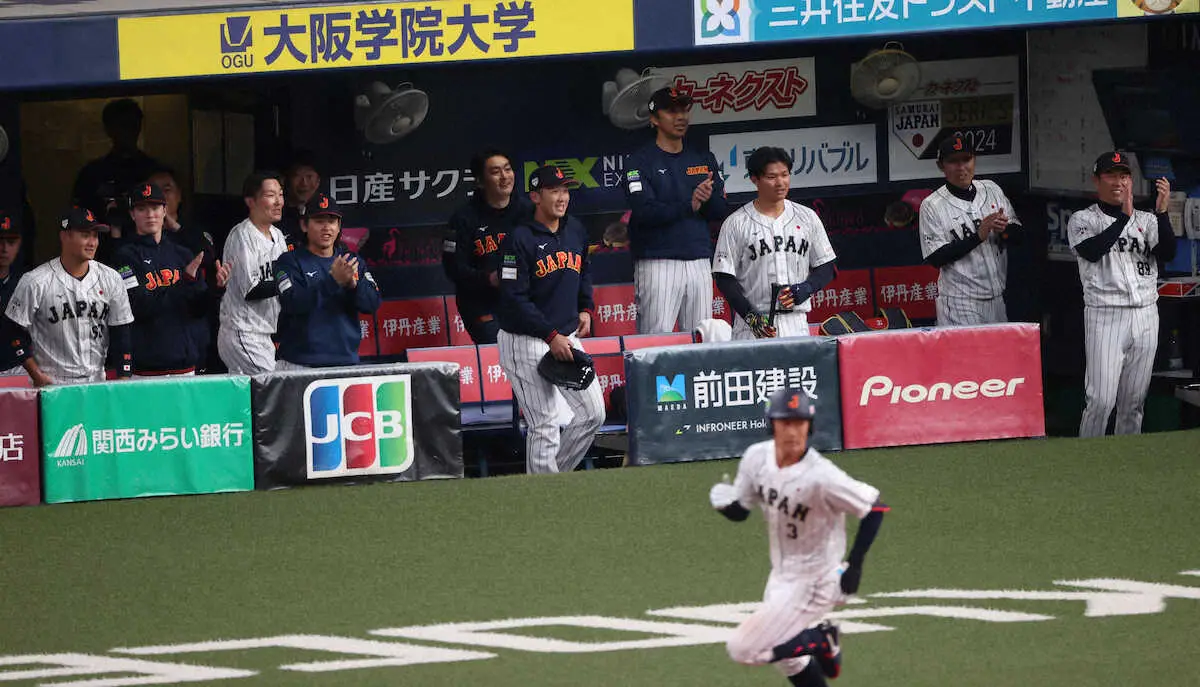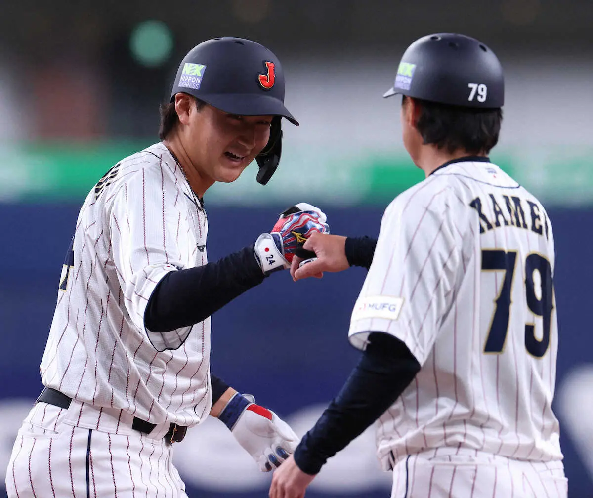 <日本代表・欧州代表>5回1死一、二塁、近藤の適時二塁打で生還し、村上、源田、石川、紅林らとハイタッチをかわす西川(右)=撮影・北條 貴史