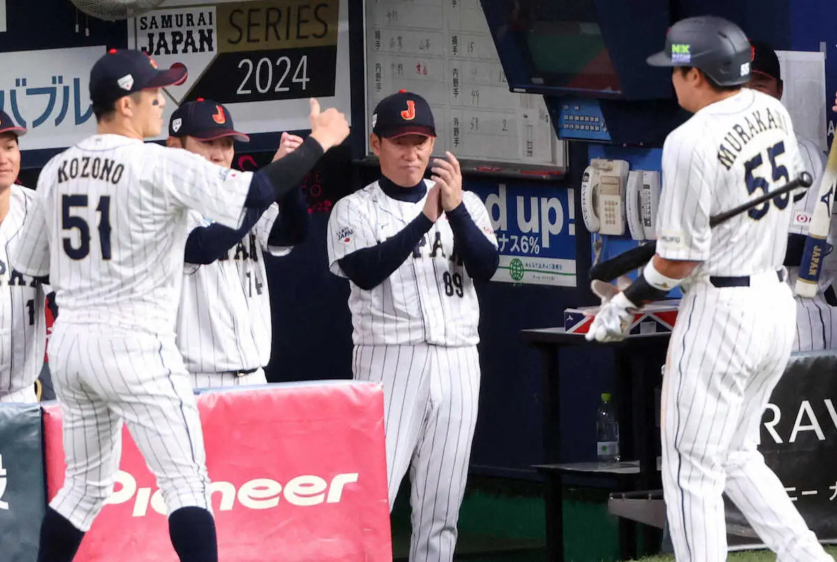 <日本代表・欧州代表>初回、先制適時打を放った村上(右)を拍手で迎える井端監督(中央)(撮影・北條 貴史