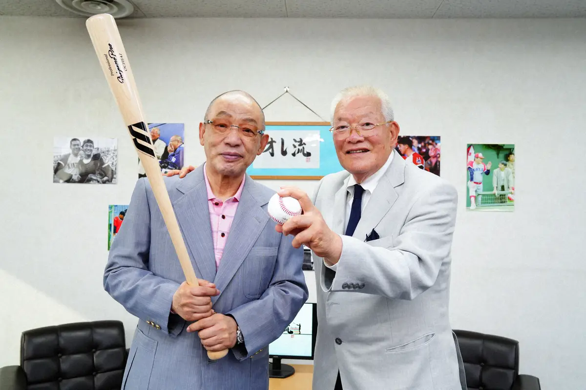 鈴木氏は「久しぶりやな。元気でなにより。今日はありがとう」と落合氏と握手。机に並べられた現役時代の写真を懐かしそうに見渡した。