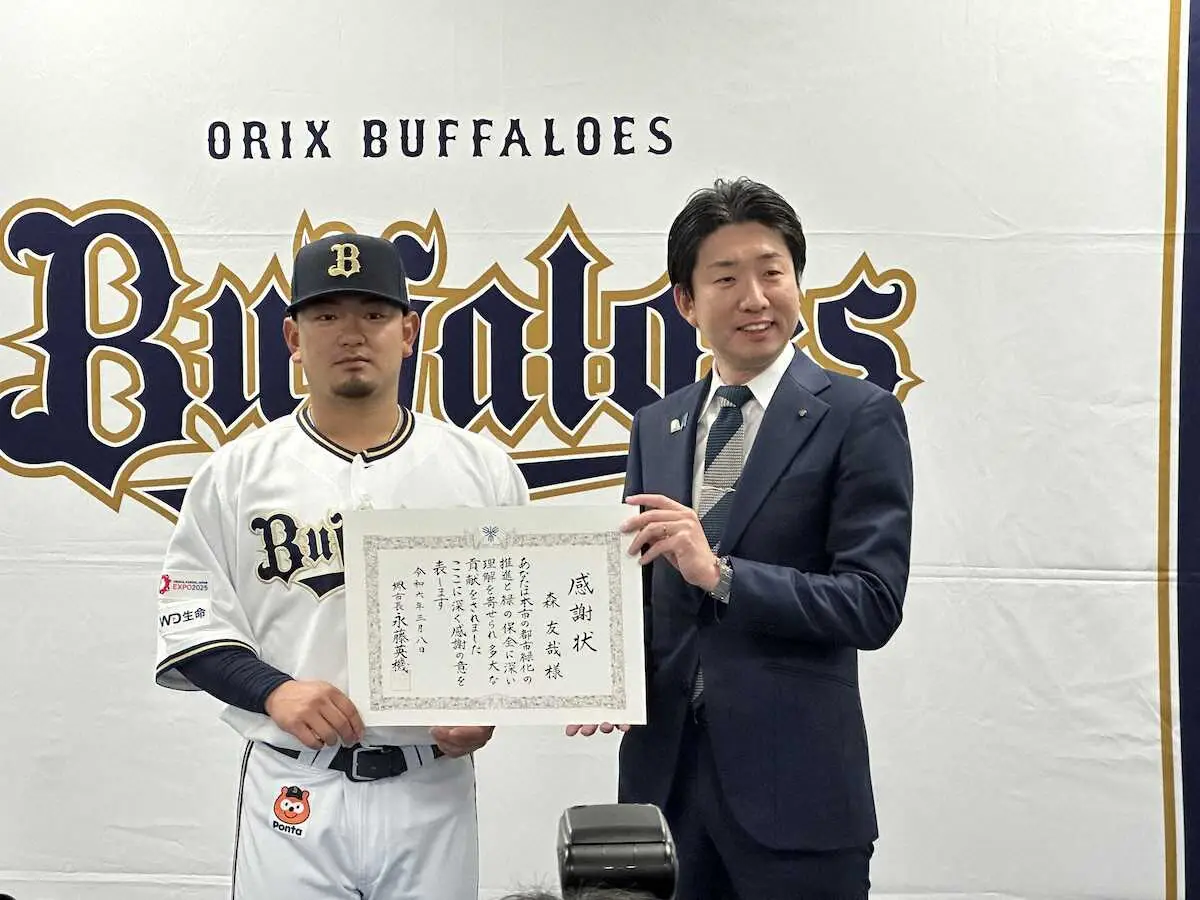 オリックスの森友哉捕手(28)が8日、地元大阪府堺市の永藤英機市長(47)より「堺市はなみどり基金」への寄附活動に対する感謝状を贈呈された。