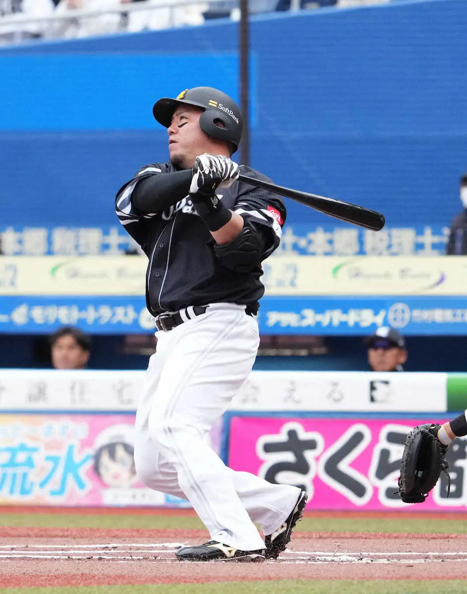 <ロ・ソ>初回、ソフトバンク・山川は先制2ランを放つ(撮影・沢田 明徳)