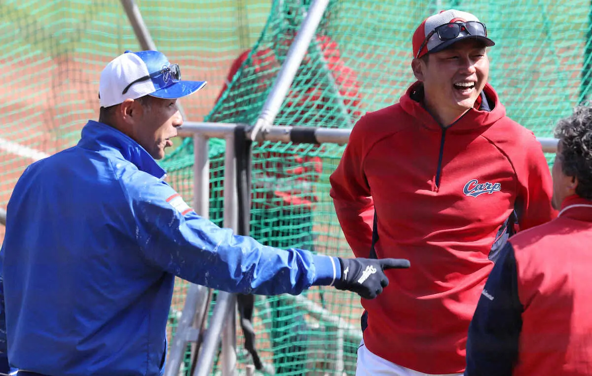 <広・中>中日・和田コーチ(左)と話す新井監督(撮影・成瀬 徹)