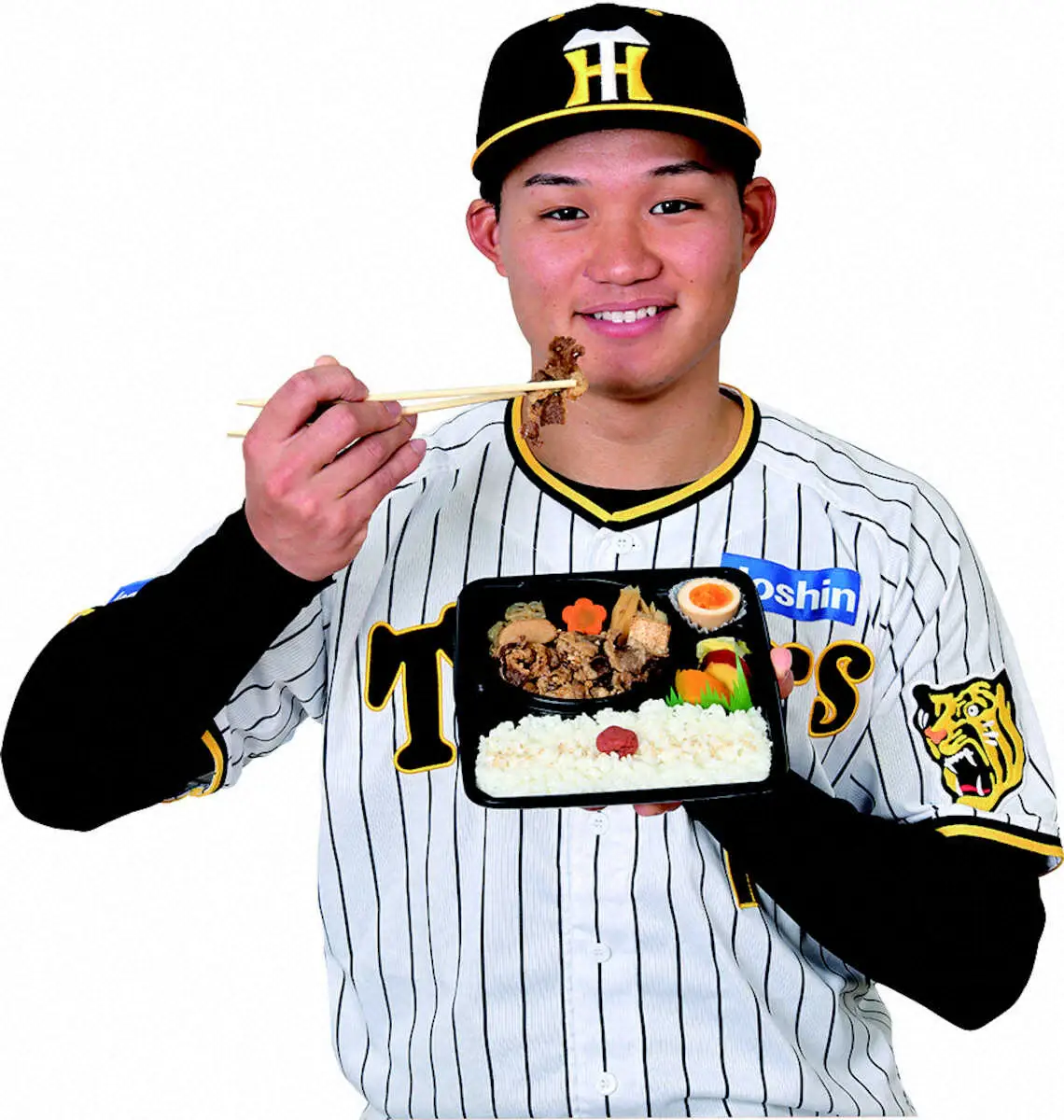 神奈川出身!森下の牛鍋風弁当をアピールする森下(阪神甲子園球場提供)