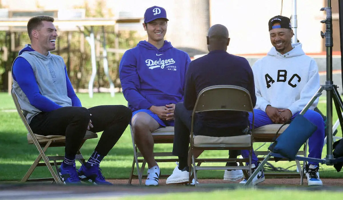 笑顔で「MLBネットワーク」の取材に応じる(左から)フリーマン、大谷、ベッツ(撮影・白鳥 佳樹)