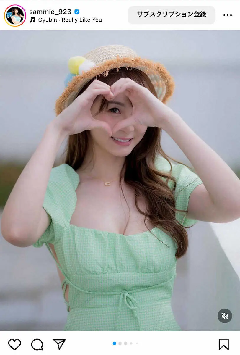 サミーは「ハッピーホワイトデー」とつづって、麦わら帽子を被り、背中がぱっくりと開いたセクシーなライトグリーンのワンピースショットを投稿した。