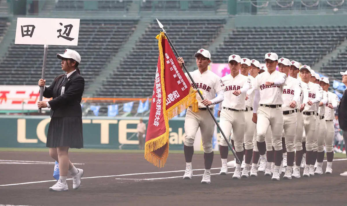 田辺(和歌山)はメンバーに足りない16人が行進した。田中格監督は「甲子園練習は15人。きょう16人になって、明日18人揃います」と笑顔を見せた。試合は明日の第2試合・星稜戦。ぎりぎりでメンバーが揃ったことになる。