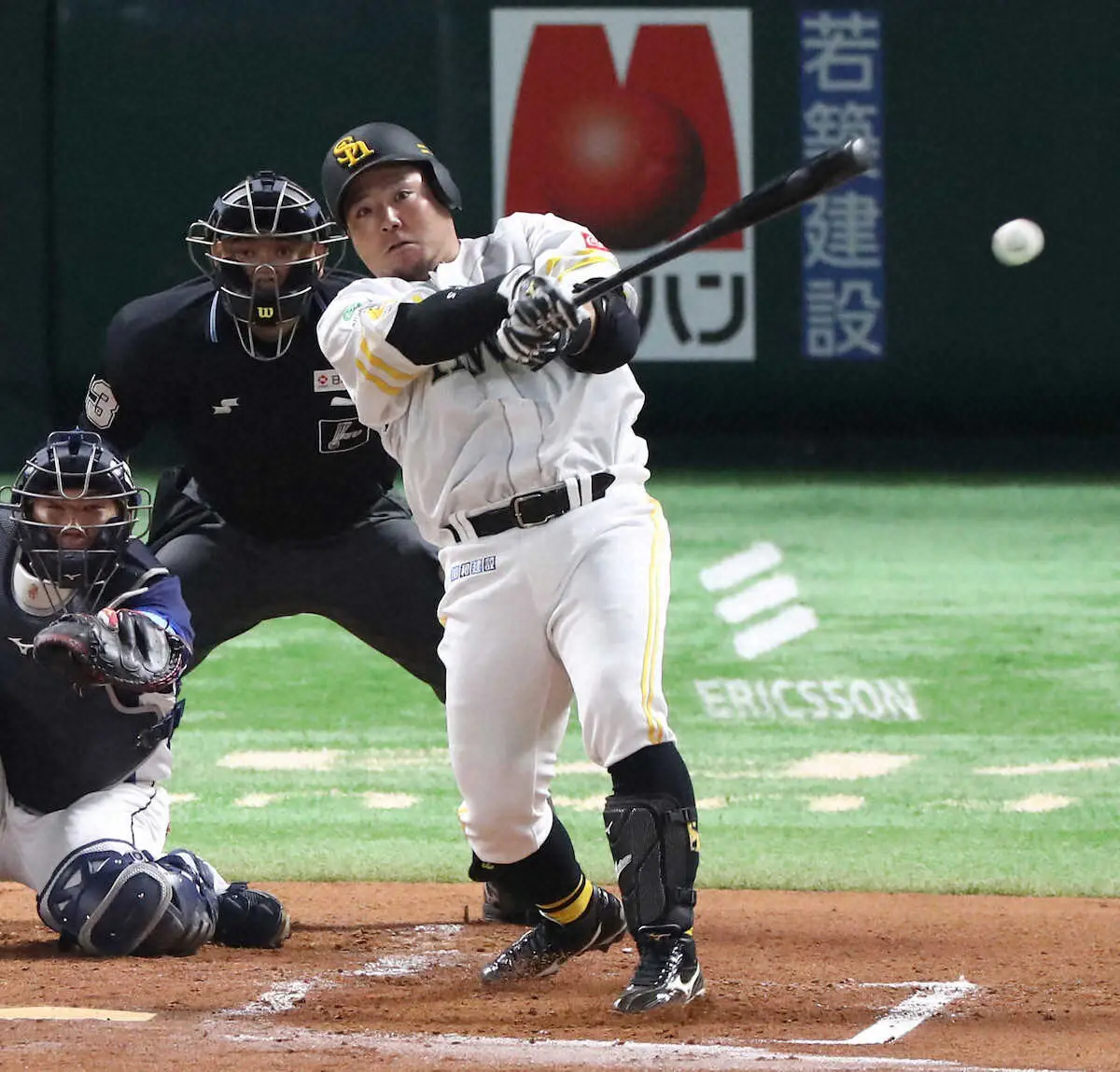 ソフトバンク山川穂高内野手が17日、西武とのオープン戦(ペイペイドーム)の第1打席にタイムリーヒットを放った。