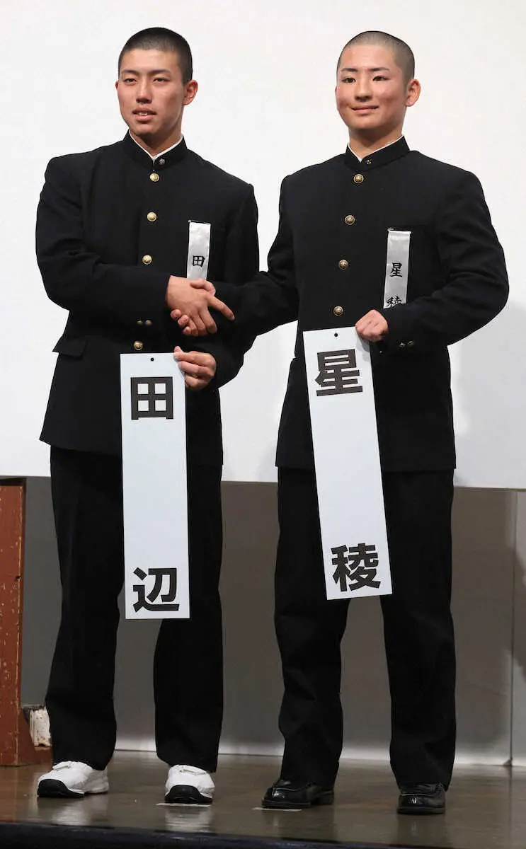 組み合わせが決まり握手する田辺・山本主将(左)と星稜・芦硲主将 (撮影・亀井 直樹)